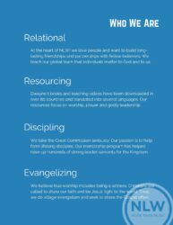 This is a page from a booklet we’re putting together for our prayer and financial partners. I think it helps capture the essence of NLW International.